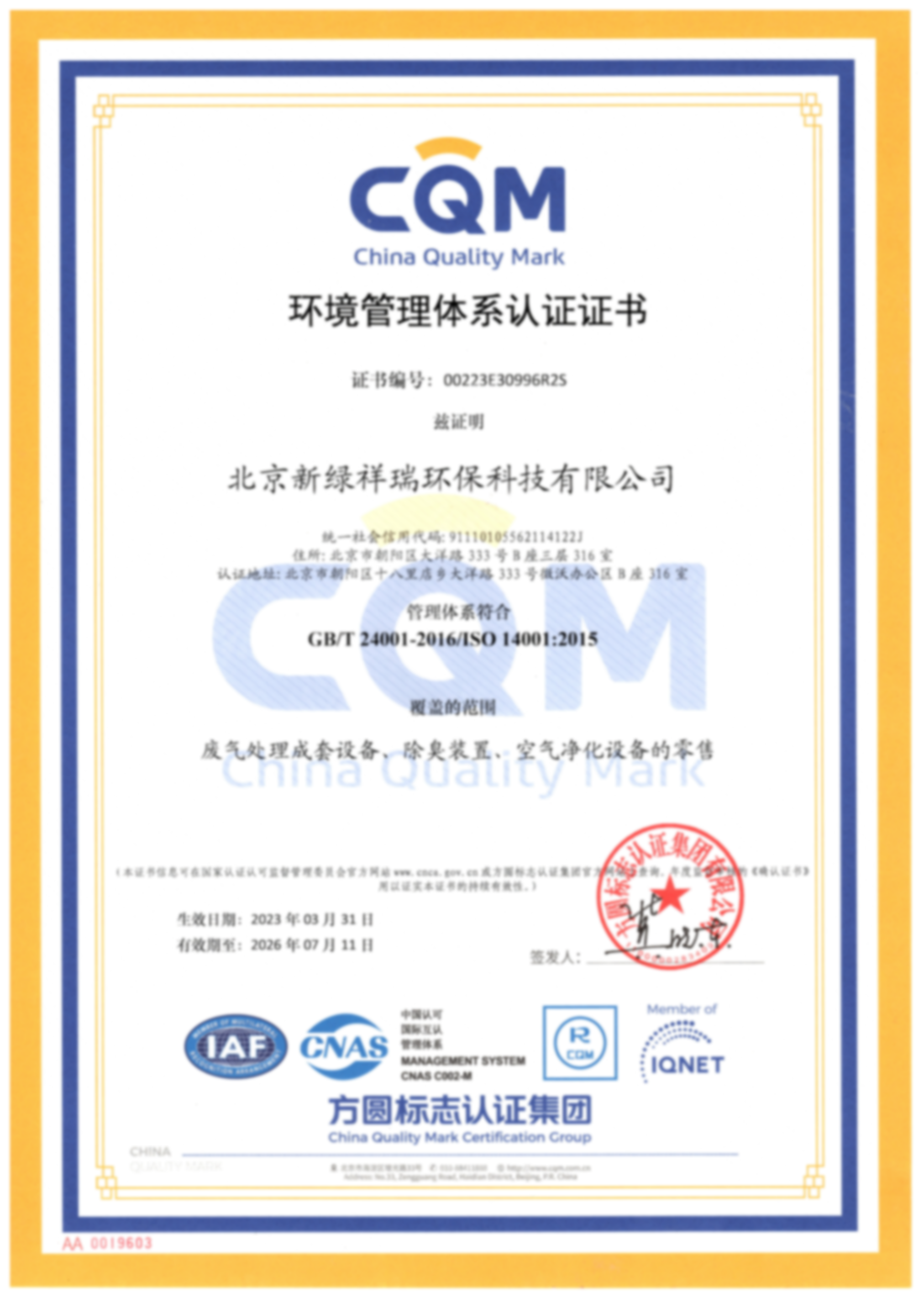 環境管理體系證書